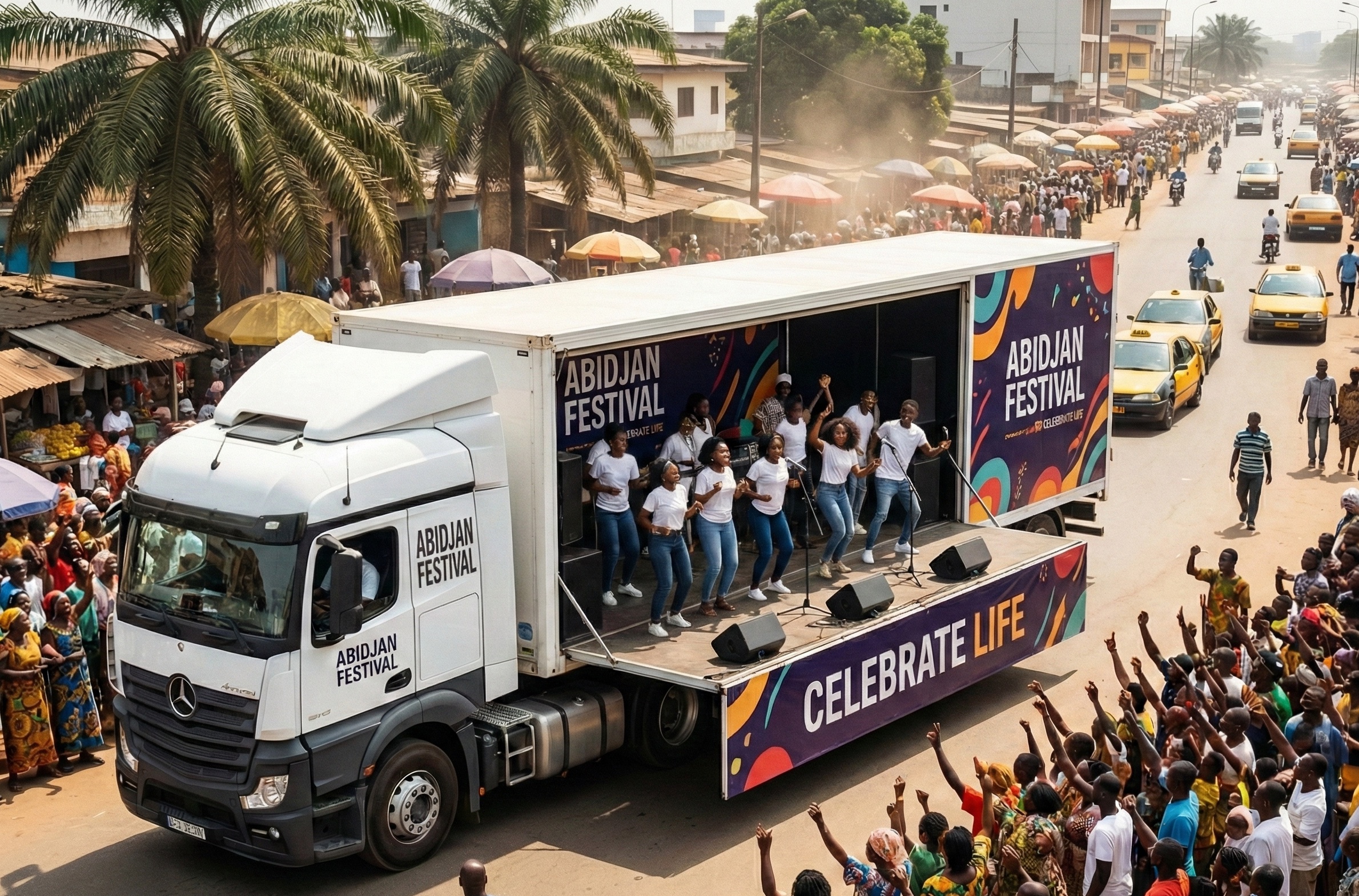 Votre marque sur le terrain. Location de camions podiums et équipes d'animation pour aller au contact direct de votre cible partout en Côte d'Ivoire.